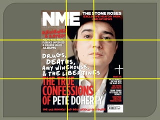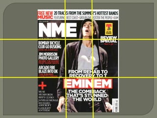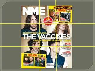The document discusses the layout and design of magazine covers, specifically music magazine NME. It notes that NME covers use strong imagery, creative fonts, and iconography associated with indie/rock music to appeal to alternative music readers. Key elements of the covers include the masthead identifying the magazine, the feature article photo to attract readers, headlines and quotes from interviews. Color schemes and fonts are consistent issue to issue but varied to keep covers looking modern. Overall the covers have a relaxed yet edgy style and use space well to provide information without overwhelming readers.