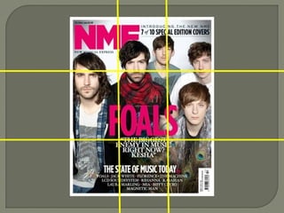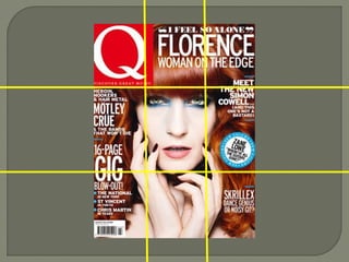 The document discusses the layout and design elements of magazine covers. It explains that magazine covers typically feature a masthead at the top left, cover line, kicker, secondary lead, caption, and other text elements. The document analyzes a specific magazine cover, noting its use of color, fonts, style, space, and how it follows typical conventions like the rule of thirds in photo placement while varying the location of some text elements. In conclusion, it states the cover is bright and eye-catching while packing in a lot of information without any dead space.