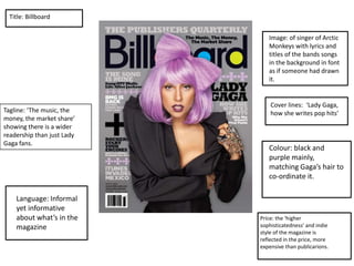 The document describes the covers of three music magazines - Q Magazine, Billboard, and Kerrang!. Q Magazine features an image of Arctic Monkeys singer Alex Turner with lyrics in the background. The cover lines promote an article about getting inside Alex Turner's head. Billboard features an image of Lady Gaga and promotes an article about how she writes pop hits. Kerrang! features an image of an unnamed band covering the magazine title, promoting them as rising rock stars of 2011. The magazines differ in price, with Q Magazine being the most expensive due to its more sophisticated indie style.