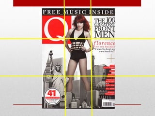 1. Magazine covers typically use consistent color schemes and fonts to create brand recognition while also relating to the theme or artist. For example, Q magazine commonly uses black, white, and red colors.