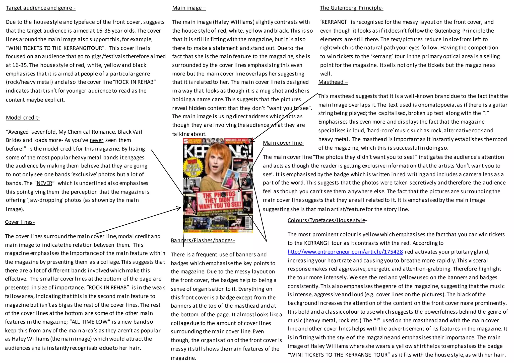 The document analyzes the front cover design of several music magazines, including their use of layout, images, colors, and text to target different audiences and promote various genres. It finds that KERRANG! uses a messy yet organized layout with yellow, red, and black colors to target rock and metal fans ages 16-35. NME takes a cleaner approach with a basic masthead and focuses on different genres for an audience of 16-45. Mixmag emphasizes electronic dance music through its summer-themed colors, fonts, and image of the duo Disclosure.