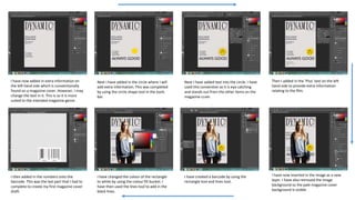 The document describes the process of creating a magazine cover in Photoshop. First, images and a background layer were added. Then various text elements like the title, date, and additional information were placed on the cover using different fonts and tools to transform and position the text. An interview excerpt and circle with additional details were also inserted. Finally, a product image and barcode were added to complete the first draft of the magazine cover design.
