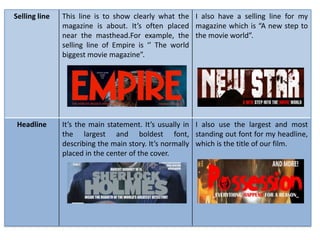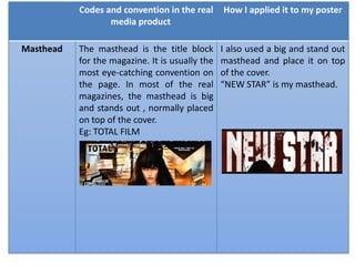 The document discusses conventions used in real media products like magazine covers and how the student applied those conventions to their poster for a school project. It explains several design elements magazines typically include such as a masthead, selling line, headline, central image, cover lines, barcode, date and price, and website address. It then describes how the student incorporated similar elements into their poster cover for a movie, including a large masthead, selling line, headline featuring the movie title, central image of characters from the film, and other typical magazine cover conventions.