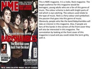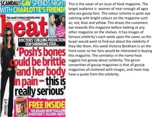 This document summarizes and compares the cover designs of several magazines targeted at different audiences. It discusses magazines focused on gossip (Heat, OK!), music (NME), football (Match of the Day), fishing, and humor for children (Toxic). For each magazine, it describes the intended audience, color scheme, images featured, and how the design conveys the magazine's purpose and would appeal to its target readers.
