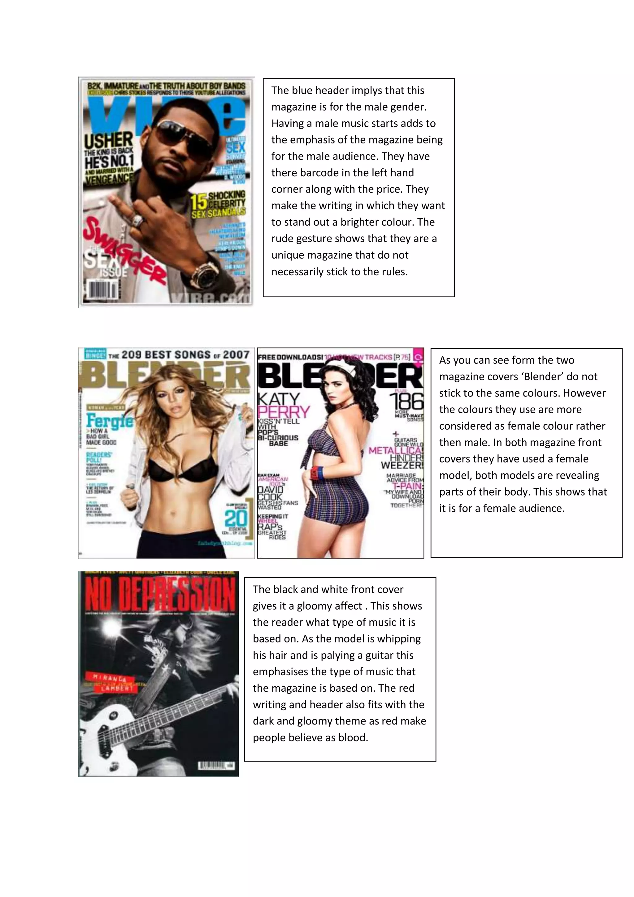 The document discusses different magazine covers and analyzes aspects of their design to infer whether they are targeting a male or female audience. Features discussed include colors used, images of male or female celebrities, types of writing emphasized, and whether designs are simple or flashy. The document examines how each magazine cover's design elements appeal more to male or female readers based on common gender associations.