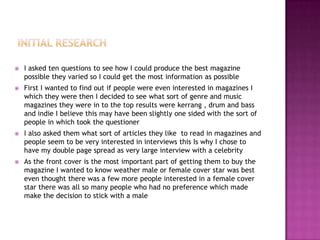 The document discusses the process of designing a music magazine. The author conducted surveys to determine reader interests, preferences for articles and cover stars. Based on the findings, they designed the magazine with a male cover star, focus on celebrity interviews, and bold visual design elements. Key aspects included a distinctive masthead, high-contrast celebrity images, and catchy cover lines. The author provides examples of their logo, cover, contents page and interior article designs, explaining design choices and why they felt each element was effective.