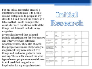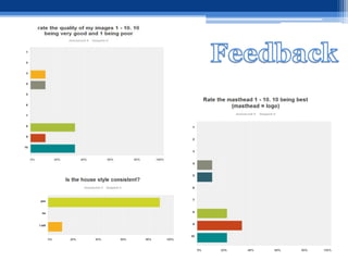 Cesca Haig created a magazine design project. She conducted research through questionnaires to determine what content and design elements readers preferred. Her research found that advertisements, interviews, more images than text, and free gifts would attract buyers. She used this research to design her magazine's cover, contents page, and a double page interview spread. Cesca gathered feedback on her magazine design through an online survey to evaluate her work.