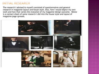 James Fox conducted research on magazine layout and house style by distributing questionnaires and researching magazine designs. He analyzed various magazine cover and content page designs to understand differences and how to design his own magazine. The house style he chose was Kozuka Mincho, which he felt had a catchy ring to it and worked well with the "Sharpy but Smarty" layout of his magazine. He created basic and more advanced designs for the cover, contents page, and double page spread to enhance the house style and add more design elements. To obtain feedback, he created a questionnaire and calculated the results.