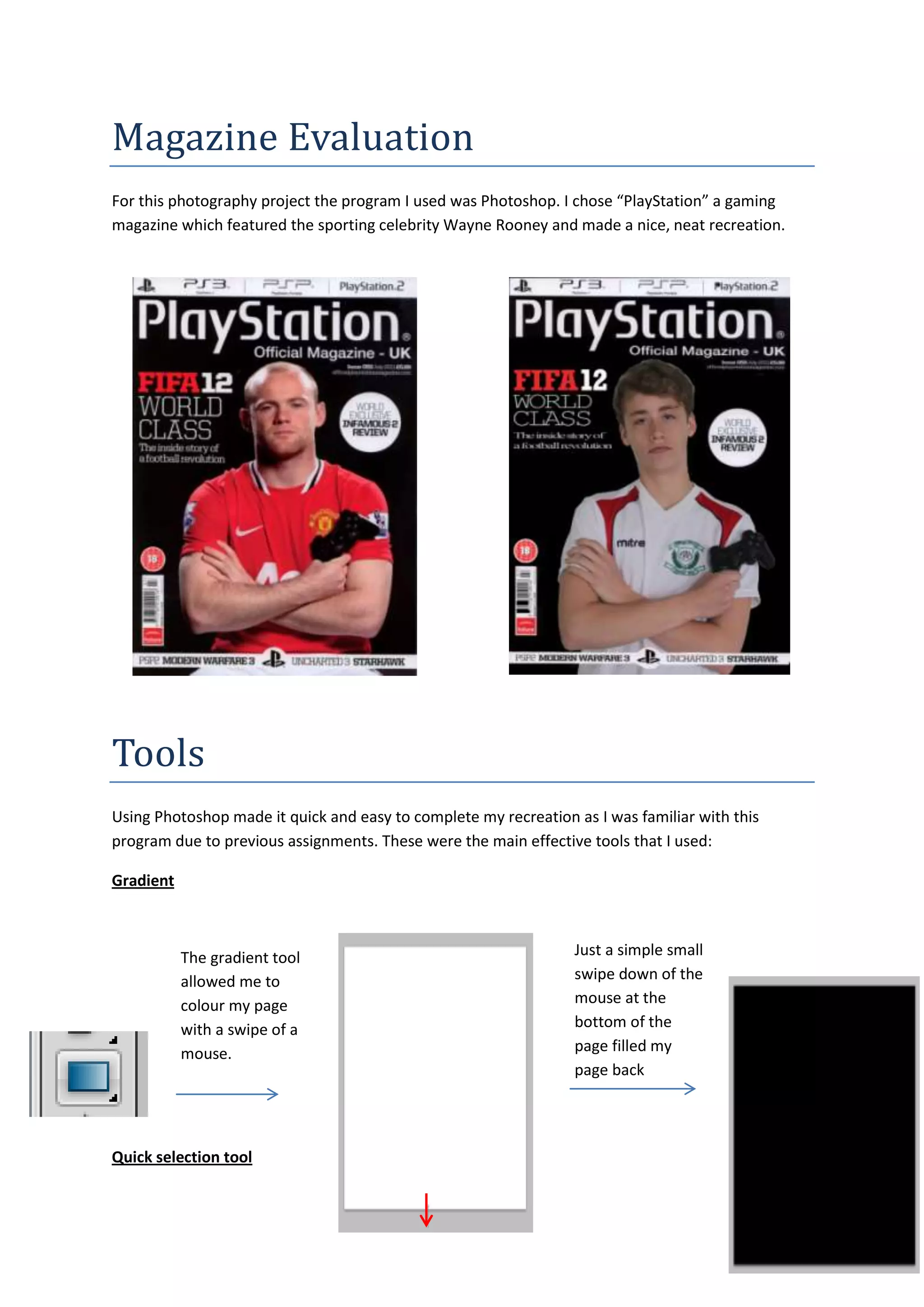 The student created a recreation of a magazine cover for a photography project using Photoshop. While familiar with Photoshop from prior assignments, the student learned new text editing skills. The strengths of the recreation included accurate color, positioning of images and text. Weaknesses included fonts that did not exactly match the original and duller colors compared to the original's vibrant tones. Overall, the student was pleased with their efforts and believed the recreation looked similar to the original cover.
