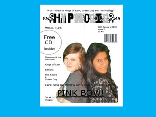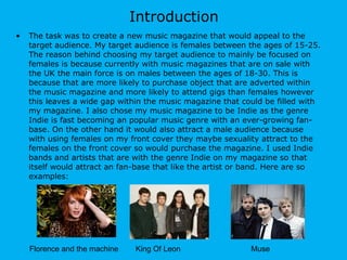 The document evaluates the creation of a new music magazine targeted primarily at females aged 15-25, addressing a gap in the market dominated by male-oriented publications. It emphasizes the inclusion of indie music elements to attract both female audiences and a male demographic drawn to the magazine's female imagery. The author discusses the design choices, distribution strategies, and technological skills developed during the magazine's construction process.