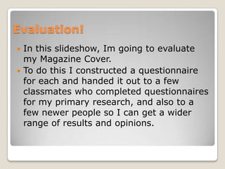 The document summarizes the results of a magazine cover evaluation conducted by distributing questionnaires to classmates and others. Key findings from the questionnaires include: