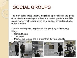 The document evaluates a magazine the author created. It represents teenagers who are in college or school and have part-time jobs, going to parties, concerts, and extreme events. The model used in the magazine is similar in age, clothes, and interests to the target audience. An appropriate media institution to distribute the magazine would be one like Immediate Media that focuses on niche magazines for specific audiences, as this magazine targets teenagers who like rappers. Through creating the magazine, the author learned that every detail must be considered to engage the target audience, including colors, images, text, and layout to attract the right viewers and not overwhelm them.