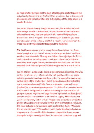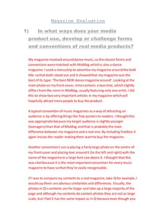 This document provides an evaluation of a magazine created by the author for a class project. It summarizes the key ways the magazine uses and challenges conventions of real music magazines. It includes a two-shot photo on the cover instead of just one artist, and offers freebies like posters to attract younger readers. Layout and design conventions like large central photos and text wrapped around are followed. The target audience is described as mainly teenagers interested in dance music, represented through bright colors, popular artists featured, and an emphasis on social media interaction. A dance music publisher like MixMag's would be a suitable company to distribute the magazine commercially.