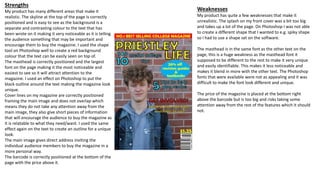 My media product uses conventions of magazines but also challenges some conventions. It has key magazine features like a masthead at the top in the largest font, a main image giving direct address, and cover lines framing the image. However, some features differ from conventions, like the masthead not having its own unique font and the price being larger than typical. Photoshop was used to create colored backgrounds, text effects, and shapes, though font and shape options were limited. Strengths include positioning of elements and use of contrasting colors, but weaknesses include a large splash and masthead blending in due to shared font.