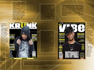 The document is an evaluation of a student's magazine project called "Krunk Magazine" which aims to emulate an existing hip hop magazine called "Vibe". The student chose black, yellow and white colors for the magazine inspired by "Vibe". The front cover features a hip hop artist and skylines. The contents page also features a hip hop artist and uses the same colors for consistency. A two-page spread uses red, black and white colors and features another hip hop artist. The target audience is ages 11-40 interested in hip hop music.