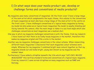 The document is a student's analysis of their media product, a magazine. It discusses how the magazine both uses and challenges conventions of the genre. It represents young females interested in funky house music aged 12-19. The magazine would be distributed by IPC Media due to their large female audience. The target audience was attracted through bright colors, large fonts, and attractive photos of young female models. The student learned Photoshop skills like editing photos, adding effects and maintaining a consistent color scheme and style.