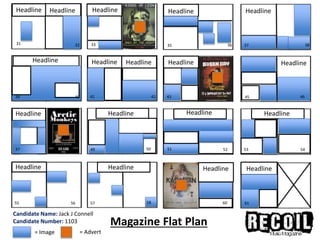 This document appears to be a magazine layout plan listing various article headlines, images, advertisements, and sections such as reviews, interviews, and details about the magazine's website and social media. The layout includes over 50 items spread across multiple pages, demonstrating a full magazine issue plan with a variety of content types.