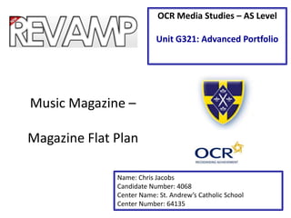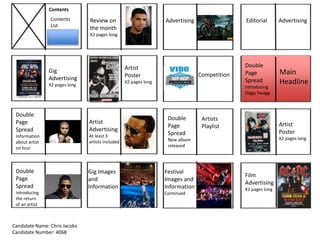This document contains a flat plan for a music magazine. The flat plan outlines the content and layout across multiple pages. It includes sections for reviews, advertising, editorials, artist profiles, gig and festival information, playlists, and competitions. The magazine plan aims to profile both established and up-and-coming artists through stories, reviews, and advertisements across its pages.