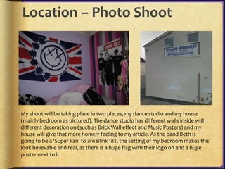 The document discusses plans for a photo shoot to showcase a "super fan" of the band Blink 182. Locations will include the subject's dance studio and bedroom, decorated with Blink 182 memorabilia. Practice photos were taken in the subject's home, with the subject posing proudly in a Blink 182 shirt. The photos are intended to portray the subject's intense fandom and obsession with the band. Questions are outlined for an interview with the subject about their devotion to and history with Blink 182.