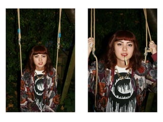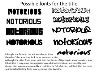 The document discusses planning for a magazine focused on hip-hop music. It includes consideration of fonts for the title, images for the front cover and contents page, and ideas for regular sections and features articles. A retro-looking font was selected for the title as it helps convey the desired style. The front cover image shows a model posing in an attitude that links to the genre's origins. The contents image references a famous photo and uses irony. Sections and articles are planned around new music, downloads, reviews, interviews, playlists and profiles of notable rappers.