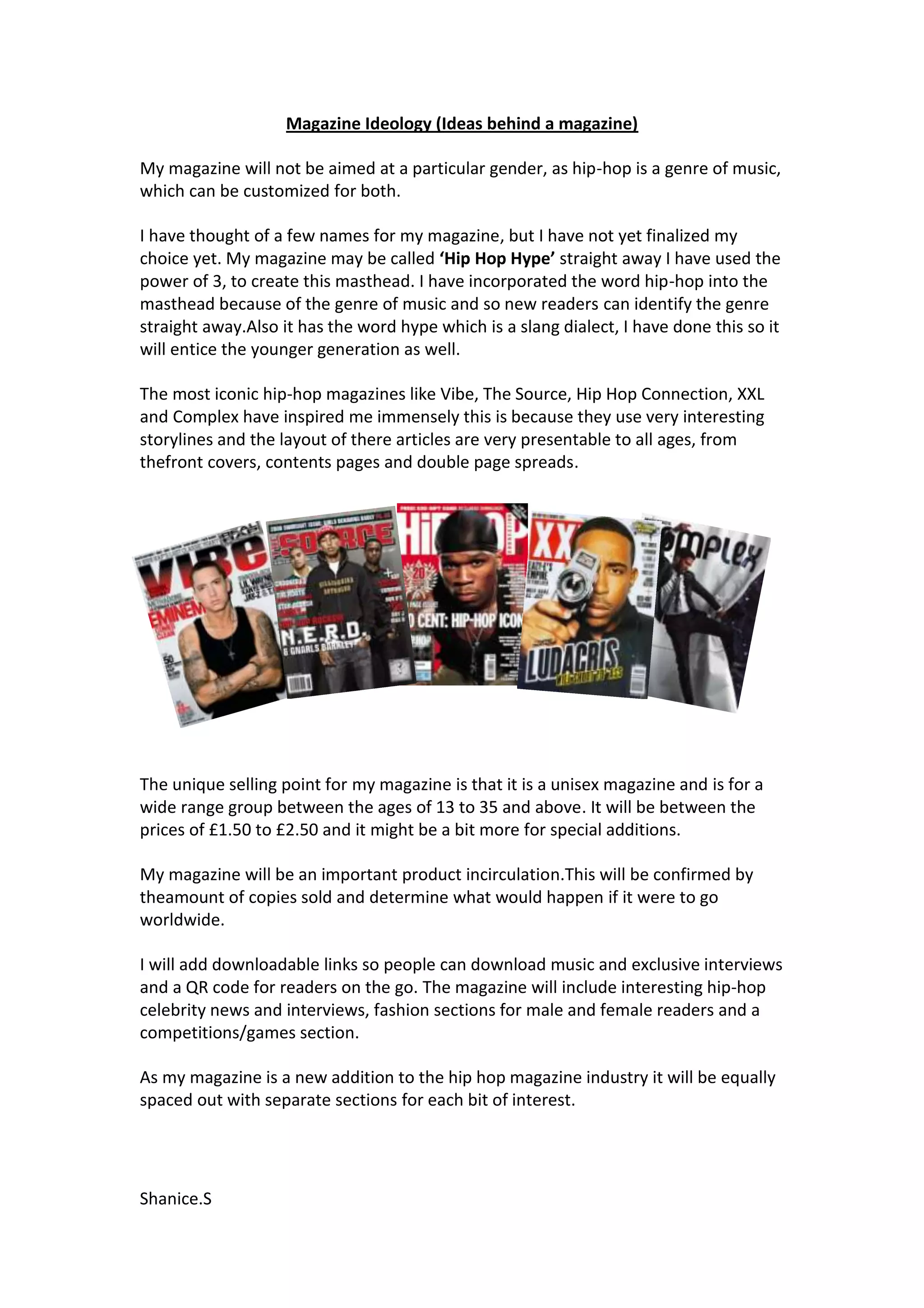 The document outlines plans for a new unisex hip-hop magazine aimed at readers aged 13 to 35. The proposed name, "Hip Hop Hype", incorporates hip-hop into the title to identify the genre. Inspiration comes from iconic hip-hop magazines known for interesting stories and layouts. The magazine will include celebrity news, interviews, and fashion sections for men and women, as well as downloadable music and interviews.