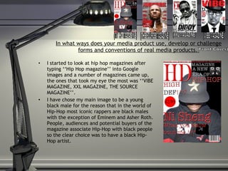 The document is an evaluation of a media product, HD magazine, created by the student. The magazine aims to represent hip hop culture. The front cover features a young black male artist to represent the genre. Text and images are used throughout in a way that develops conventions from real hip hop magazines like positioning, fonts and colors. The target audience is those interested in hip hop music aged late teens to early 30s. The student learned about using Photoshop and improved positioning of elements from their preliminary work.