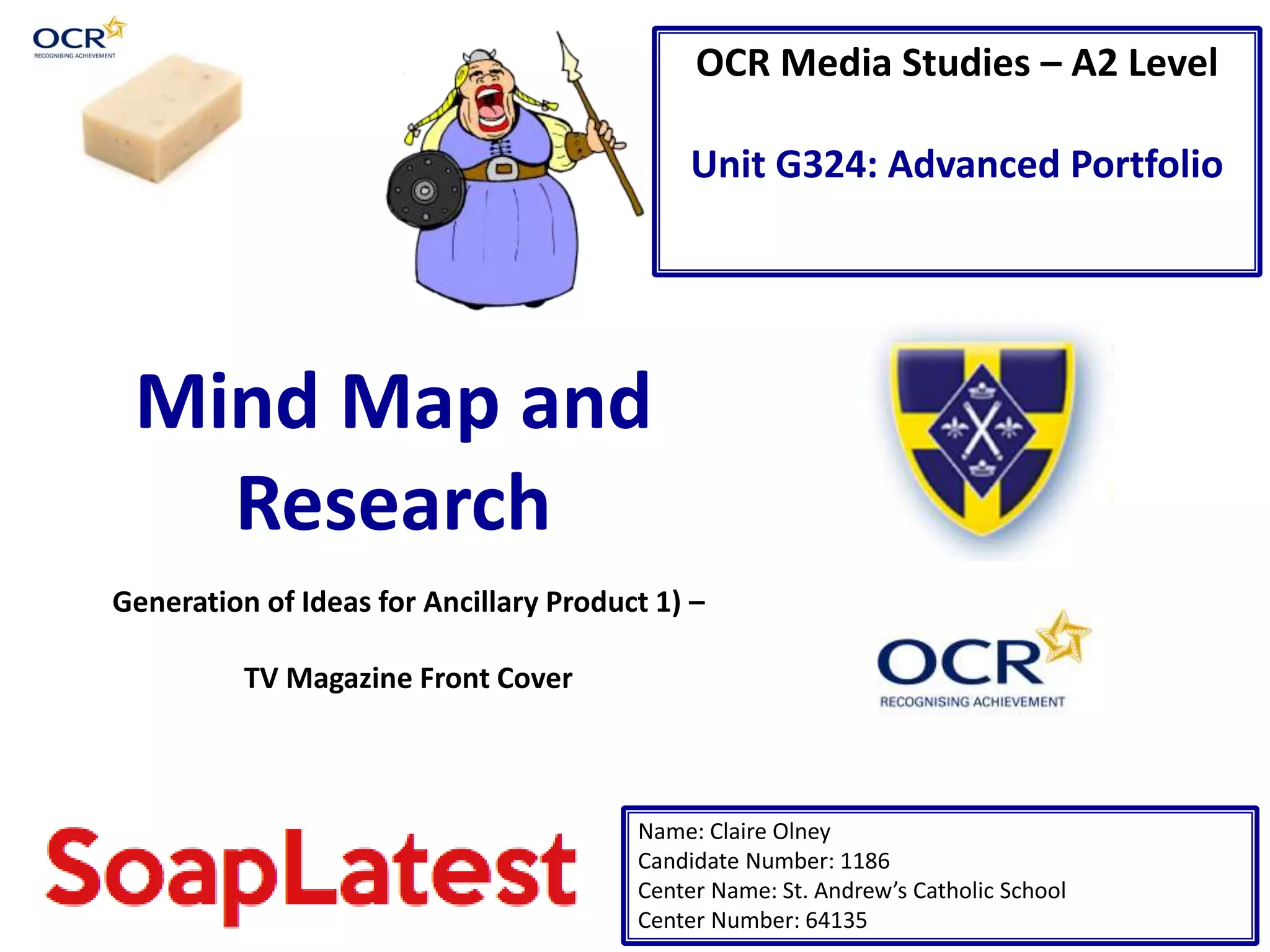 This document provides research and planning for an ancillary product, a TV magazine front cover, by a student named Claire Olney. It discusses the history, circulation, and target audience of the magazine Inside Soap, which is the source of inspiration. Ideas are generated for the magazine's masthead including "SoapLatest", "SoapDisclosure", and "ExclusiveSoap". Fonts such as "Keep Calm" and images are considered to attract readers. Possible headlines use questions or buzz words to intrigue readers. The needs are outlined for main images of characters and cover lines featuring different soap operas.