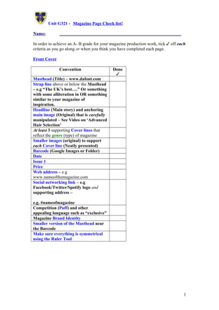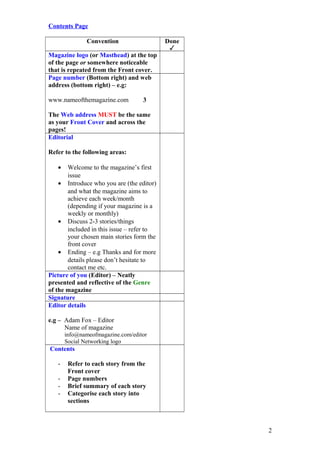 This document provides a checklist for creating the pages of a magazine, including requirements for the front cover, contents page, editorial, and a double-page interview spread. It lists various design elements and content that should be included on each page, such as the magazine masthead, headlines, images, captions, contact information, and social media links, in order to achieve a high grade. Pages must maintain consistent branding and cross-platform promotion. The checklist aims to guide students in professionally producing a polished magazine from start to finish.