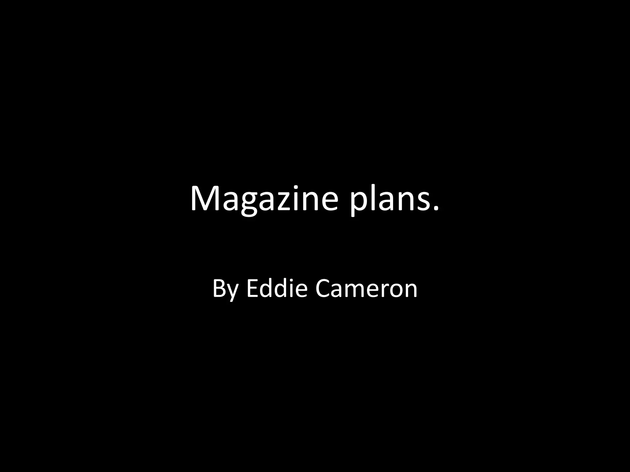 Eddie Cameron is drafting the layout for a magazine cover and contents page. For the front cover, he has chosen a black and red color scheme and included common features like the barcode and website address. The main image is of a model with red hair to catch viewers' eyes. For the contents page, Eddie has selected a standard layout with an image in the middle and page numbers on the right. He will highlight page numbers and include rhetorical questions to encourage reading the articles. The double-page spread will feature a central image relating to the article and fun fact boxes alongside the text. Eddie aims to contrast serious content with lighter elements.