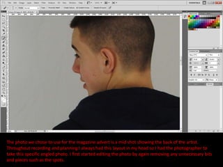 The photo used for the magazine advertisement shows the back of the artist from a mid-shot angle, as envisioned by the creator throughout planning and recording. Minor edits were made to remove unnecessary elements from the photo. A black and white effect was applied, matching the effective style of the DVD cover and linking the two pieces. The same font from the DVD cover was used for consistency. Experimentation led to selecting orange text that provided the most professional look. Elements from the DVD cover like its front were incorporated while maintaining separation and a creative style. Additional details finished the advertisement.