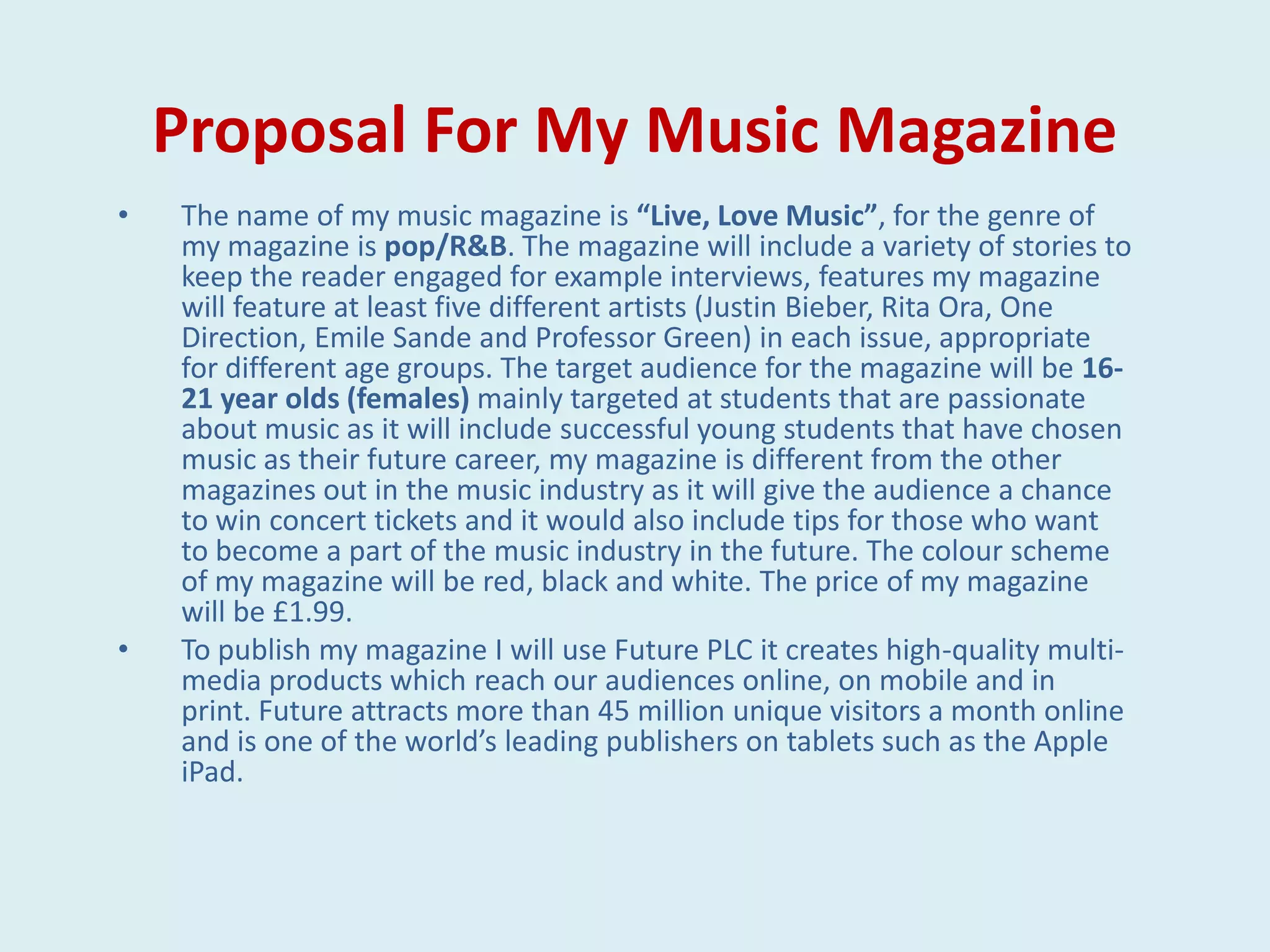 The proposal outlines a music magazine called "Live, Love Music" targeted at 16-21 year old female students interested in pop/R&B music. Each issue will feature interviews and profiles of 5 popular artists and include opportunities to win concert tickets. The magazine will be published by Future PLC and have a price of £1.99, with a red, black, and white color scheme. The masthead font was chosen to stand out against magazine covers.