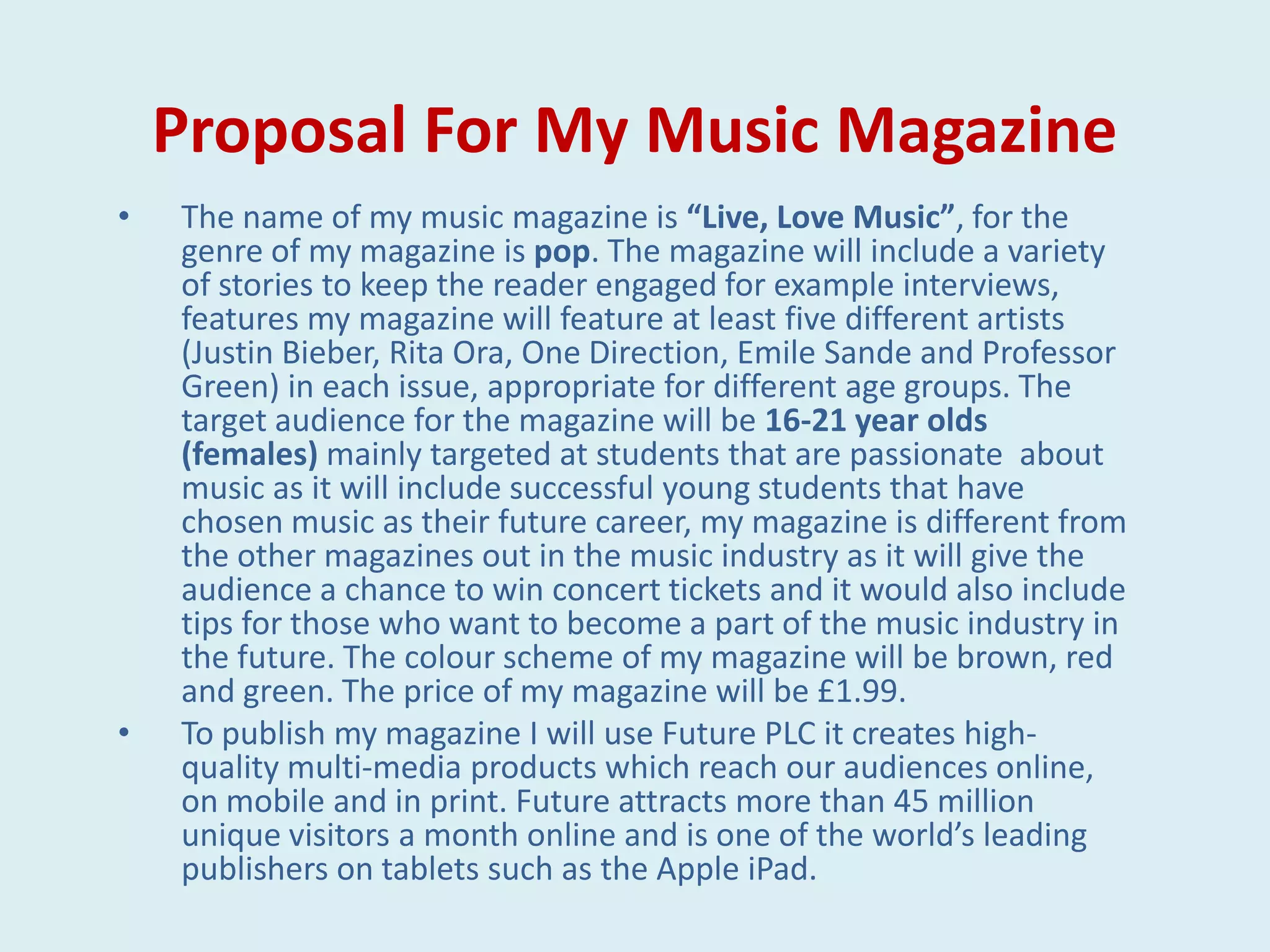 The proposed music magazine is called "Live, Love Music" and will feature pop artists like Justin Bieber, Rita Ora, One Direction, Emile Sande and Professor Green in each issue. The target audience is 16-21 year old female students passionate about music, and it will provide career advice while also including contests to win concert tickets. The magazine will be published by Future PLC and have a brown, red and green color scheme, with a price of £1.99 per issue.
