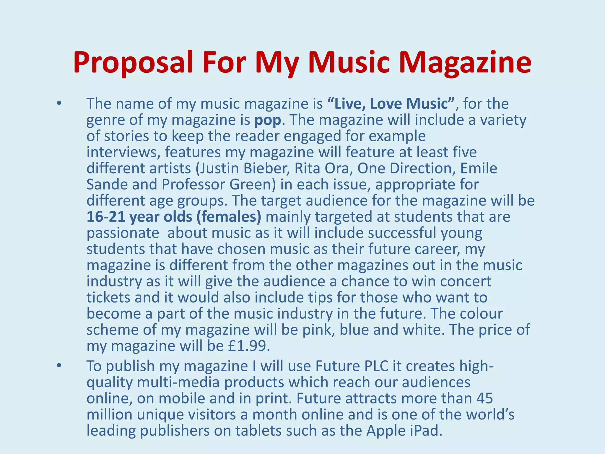 The proposed music magazine is called "Live, Love Music" and will feature pop artists like Justin Bieber, Rita Ora, and One Direction. The target audience is 16-21 year old female students interested in music. Each issue will profile at least five artists and include interviews, features, and opportunities to win concert tickets. The magazine will be published by Future PLC and use a pink, blue, and white color scheme with a price of £1.99.