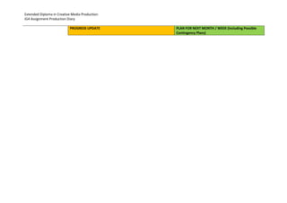 This document outlines the 14-week progress plan for creating a magazine as part of an extended diploma in creative media production. It details the weekly goals, which include researching example magazines, creating mood boards and layout plans, drafting articles, designing pages in Photoshop, taking and editing photos, finalizing designs, gathering audience feedback, and completing an evaluation. Potential issues are acknowledged and backup plans may be needed if problems arise during the magazine's creation.