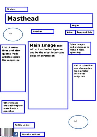 The document outlines the typical layout and elements of a magazine cover, including the masthead, slogan, issue date, price, cover lines and pull quotes from articles to entice readers, a main background image to persuade audiences, and additional images and links to social media pages to make the cover more appealing.