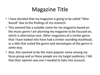 Vicky Lawrence proposes a magazine called "Alter Sound" focused on alternative rock music. She describes the magazine's genre as predominantly alternative rock but also including other rock subgenres. Her target audience is males and females aged 16-24. For the front cover, she plans to feature a close-up of someone holding a rock instrument in genre-appropriate fashion. The contents page will list sections like news and features alongside 3 images. A double page spread will interview an artist with their image and a quote teasing the article.