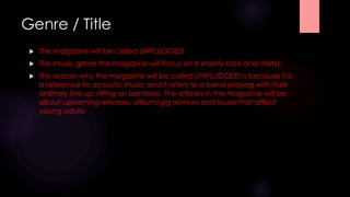 The magazine proposal outlines plans for a bi-weekly magazine called UNPLUGGED focused on rock and metal music genres. It will be published by Egmont Publishing and target males aged 15-24. The magazine will include articles on upcoming releases, reviews, and industry issues as well as profiles of pop punk, J-rock, power metal, and alternative bands both international and British. It will be distributed both physically and digitally, with an online presence and streaming content. The design will feature a black cover with red text and utilize specific fonts for the title, body text, and subheadings.
