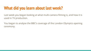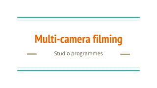 This document provides information about multi-camera filming of studio programs. It discusses different types of studio programs like game shows, talk shows, and magazine shows. It uses examples like The Gadget Show to explain the format of magazine shows, including introductions, segments on different topics, prerecorded inserts, and links between segments. Students are asked to analyze the format of The Gadget Show, identify how the multi-camera setup was used and problems filming in the studio. They then develop their own ideas for magazine show concepts and pitch one to the class.