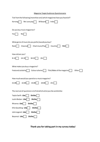 This document is a magazine target audience questionnaire that asks respondents about their music magazine preferences. It asks which magazines they've heard of, whether they buy music magazines, their preferred music genre, age, what influences their magazine purchases, how much they'd spend, and which artists they like or dislike such as Taylor Swift, Justin Bieber, Rihanna, Ellie Goulding, John Legend, and Beyoncé. The questionnaire is intended to gather information about the target audience for a music magazine.