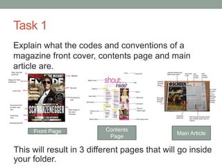1) Explaining magazine codes/conventions for front covers, contents pages, and articles.