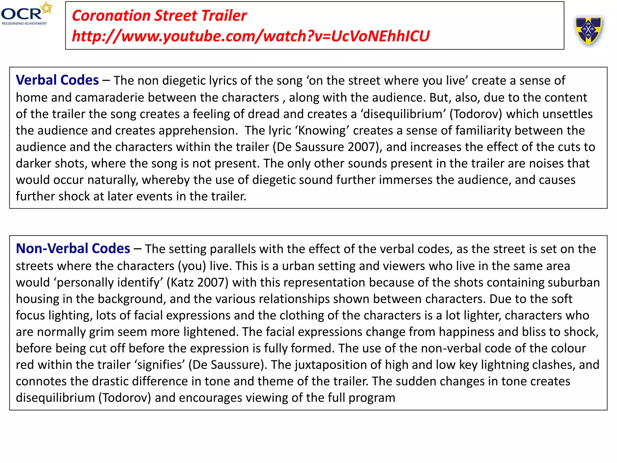 For the Coronation Street trailer, the analysis notes that the song used creates a sense of familiarity but also dread. Facial expressions change from happy to shocked. Color, lighting, camera angles, and sound effects are used to create tension and disequilibrium for the audience.