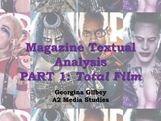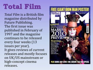 This document analyzes the cover of the British film magazine Total Film. It examines the different design elements including the masthead, main image, sell lines, additional text, and other features. The analysis finds that the magazine aims to attract readers through exclusive content, star appeal, promoting value with free items, and highlighting a variety of popular film genres. These techniques are intended to influence the design of the student's own magazine cover for their film by employing compelling sell lines and maintaining a consistent color scheme, while recognizing limitations around using star appeal with an independent film.
