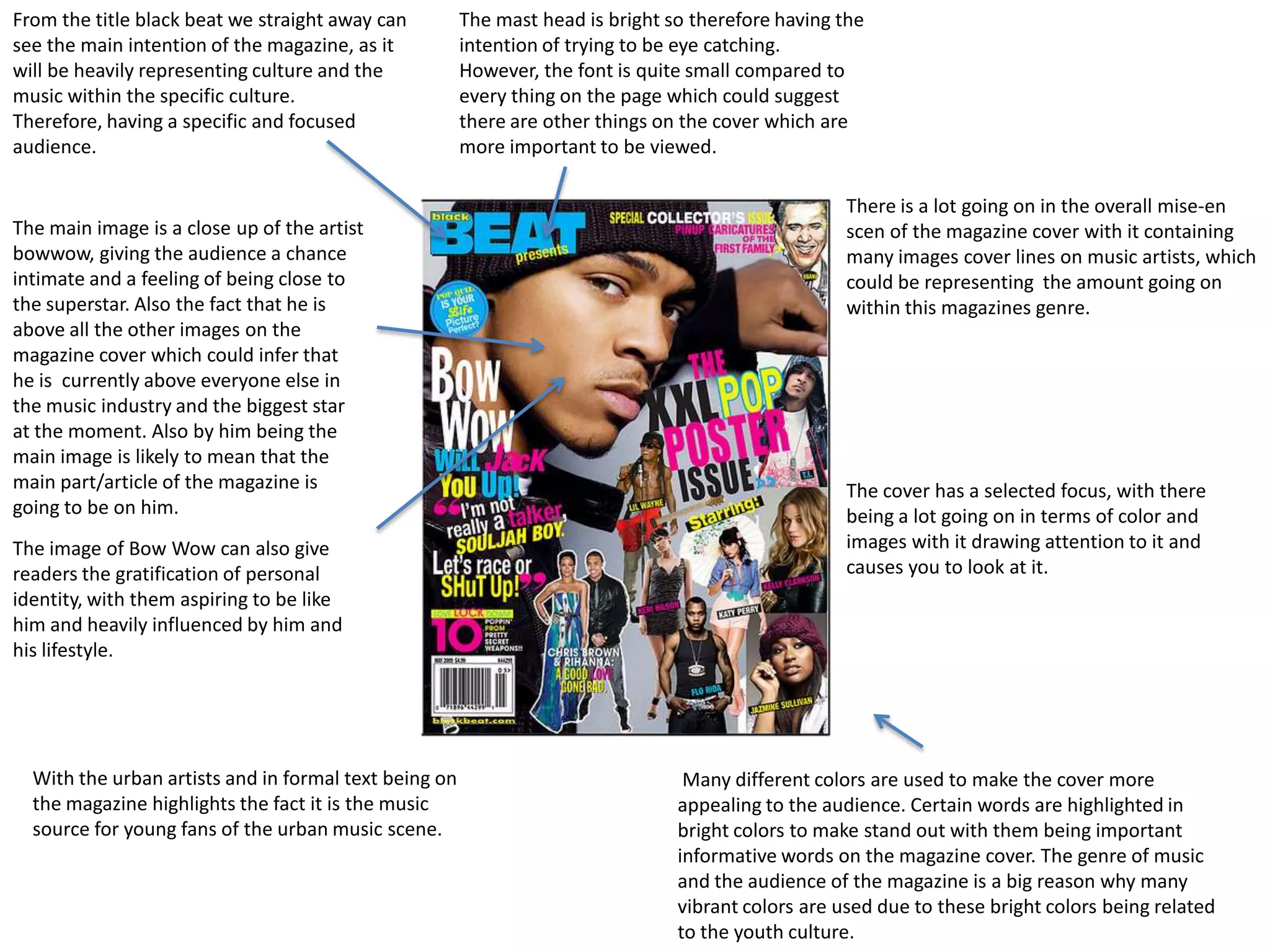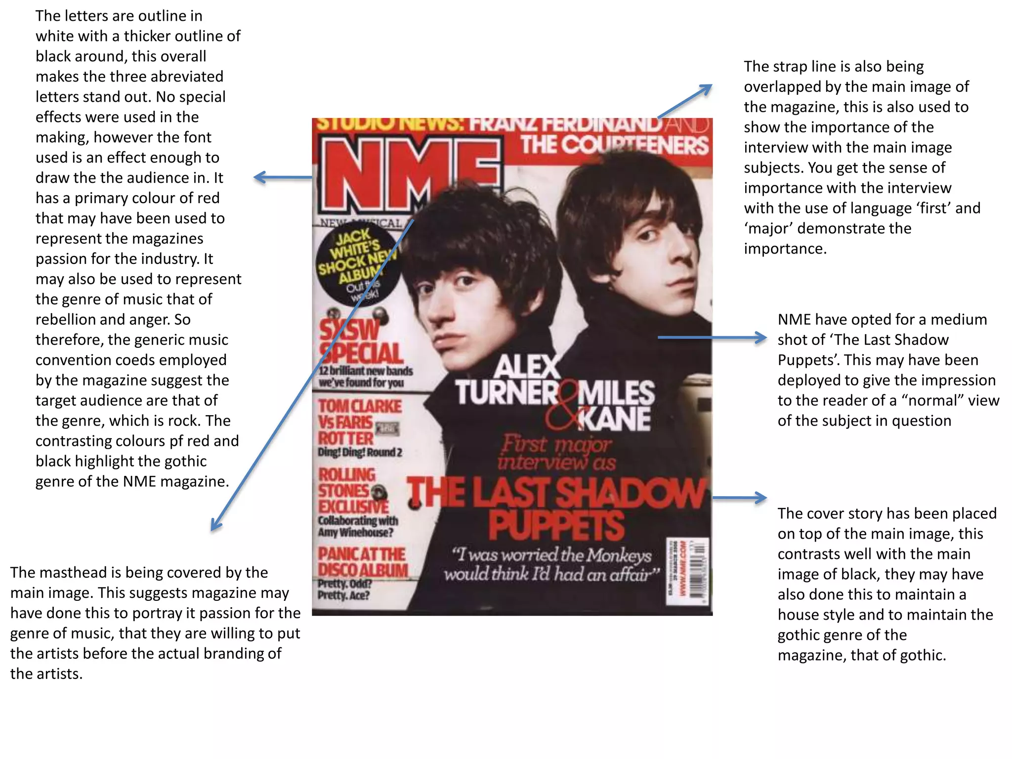The document provides details about the cover of an NME magazine. It analyzes various design elements of the cover including the use of color, font, images and text placement. The red masthead is overlapped by the main image to portray the magazine's passion for music and place artists first. Black and red colors highlight the gothic genre targeted at rock fans. Multiple images and cover lines represent the variety of music and artists covered in the issue.