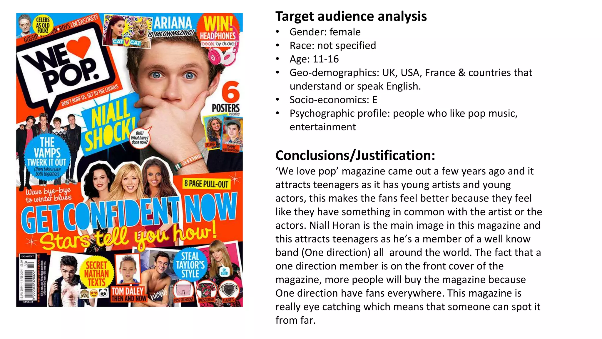 1) 'We Love Pop' magazine targets females aged 11-16 in English-speaking countries who enjoy pop music and entertainment. Featuring pop stars like Niall Horan attracts fans.