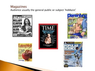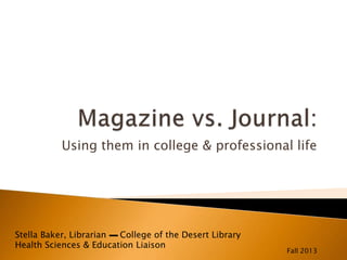This document compares magazines and journals, describing their typical audiences, purposes, and qualities. Magazines generally aim to entertain a broad audience, while journal articles are written by subject experts for other professionals. Journals undergo peer review and require citations and references to support claims, resulting in information that can be relied on more for academic and professional purposes. However, the document notes it is still important to evaluate sources critically rather than assuming their quality based on format alone.