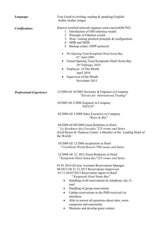 This document contains the resume of Eng. Magdolen Samir Gadelside. It outlines her personal details, education history, computer skills, language abilities, certifications, professional experience working in various roles in hotels and other companies, career objective, and personal skills. Her professional experience includes roles as a reservations supervisor, agent, and assistant reservations manager at Kempinski Hotel Soma Bay from 2008 to present.