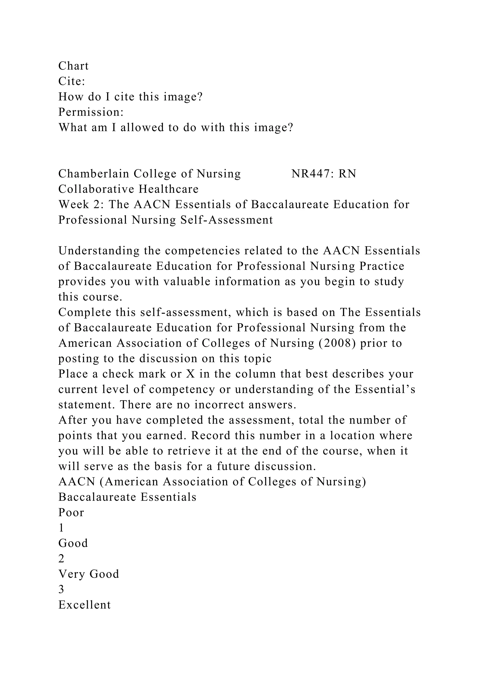 The document outlines self-assessment tools related to the AACN Essentials of Baccalaureate Education for Professional Nursing, emphasizing leadership, healthcare policy, interprofessional communication, and professionalism. It includes guidance for nursing students to evaluate their competencies in various essential areas to improve their understanding and practice. Additionally, it discusses the importance of engaging in quality and patient safety initiatives within a healthcare team context.