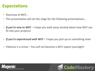 This document provides an overview of Windows Communication Foundation (WCF), a Microsoft framework for building service-oriented applications. It explains key concepts like service-oriented architecture (SOA), WCF services' components (address, binding, contract), and hosting options while emphasizing the importance of security and extensibility. Additionally, it highlights the tools for consuming and interacting with WCF services and includes various demos to illustrate these concepts.