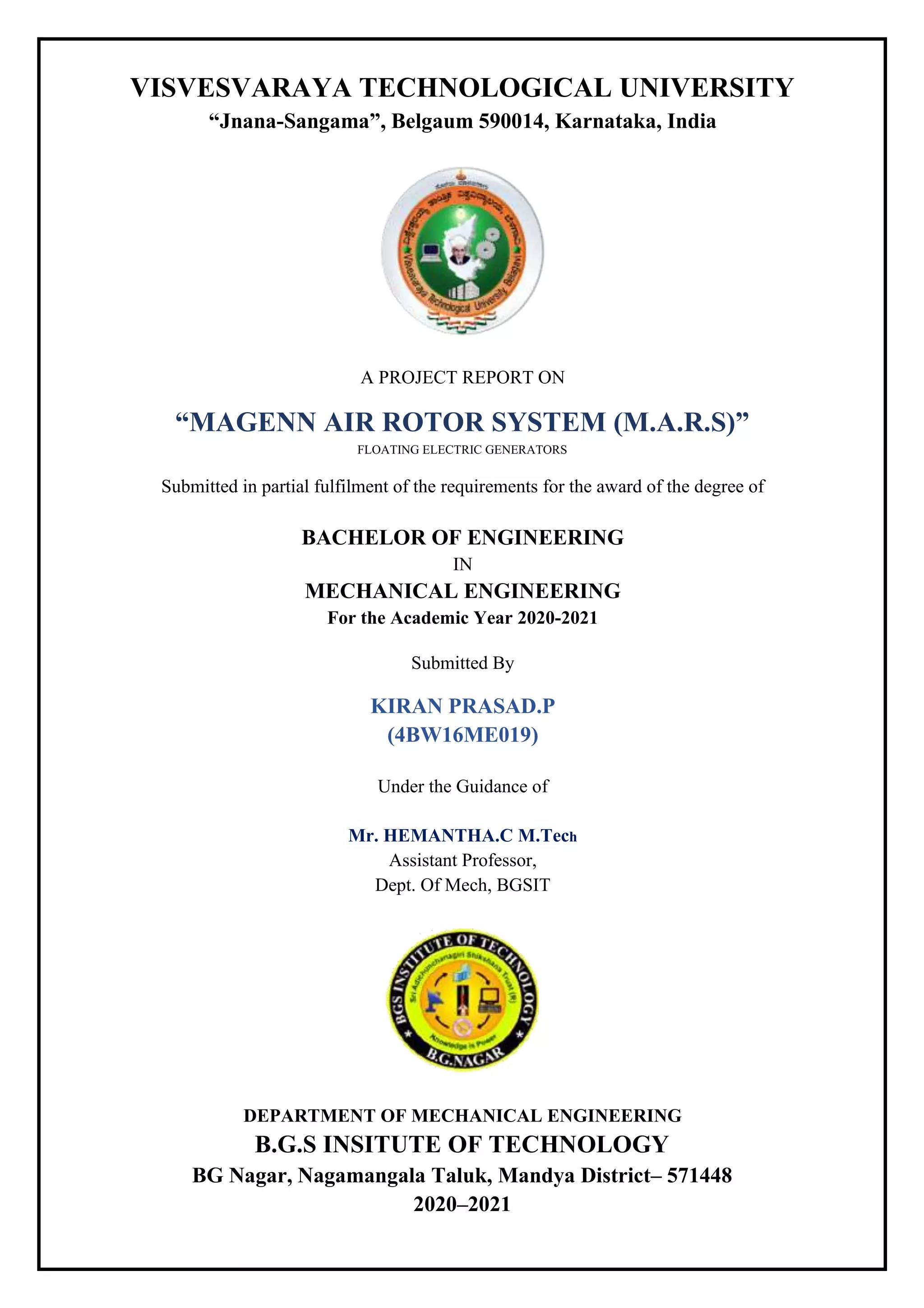 The document describes the Magenn Air Rotor System (MARS), which is a floating electric generator that uses wind power. MARS consists of a helium-filled balloon tethered to the ground that rotates in the wind to generate electricity. It has several components, including the helium balloon, tethers, generator, blades, and cooling system. MARS is designed to take advantage of stronger winds at higher altitudes compared to traditional wind turbines. The electricity generated is transferred to the ground via the tether and can be used or stored immediately.