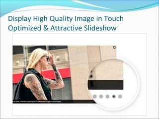 This document describes a Magento image gallery extension that allows users to display high quality images in a touch-optimized slideshow. It provides features like creating photo albums with a multilevel structure, displaying images with multiple layouts, attaching galleries to product or separate gallery pages, adding and editing image descriptions, linking albums to related products, creating unlimited albums, managing images in various galleries, placing galleries anywhere with a widget, and specifying metadata for albums and pictures.